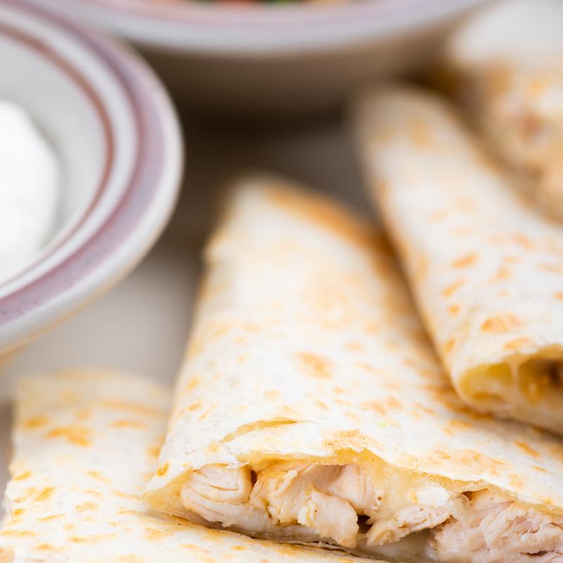 $16.00 | $19.00 • Grilled flat flour tortilla folded and cut in four pieces stuffed with grilled mozzarella cheese and choice of grilled chicken, steak, shrimp, mushrooms or veggies. Served with two sides: rice, refried beans, guacamole, pico de gallo, sour cream.