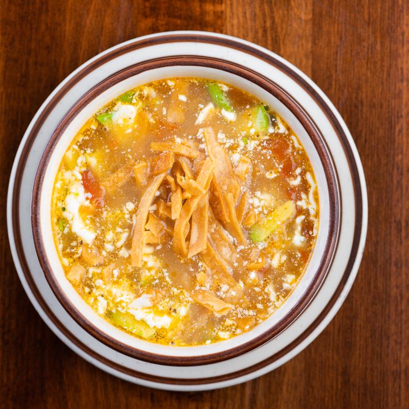 $5.00 | $8.00 • Chicken-tomato broth, queso fresco, avocado, tortilla strips, sour cream | Add Chicken $2.00