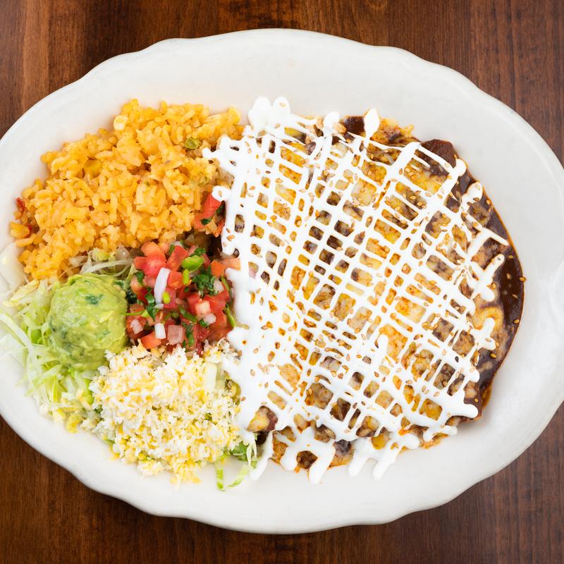 3 Rolled-up corn tortillas filled with shredded chicken, homemade mole sauce - classic mole from Puebla made with chiles, pumpkin seeds, peanuts, almonds, sesame seeds, raisins, plantains, cinnamon, and natural chocolate - topped with cheese and sour cream. Side of rice and guac salad.