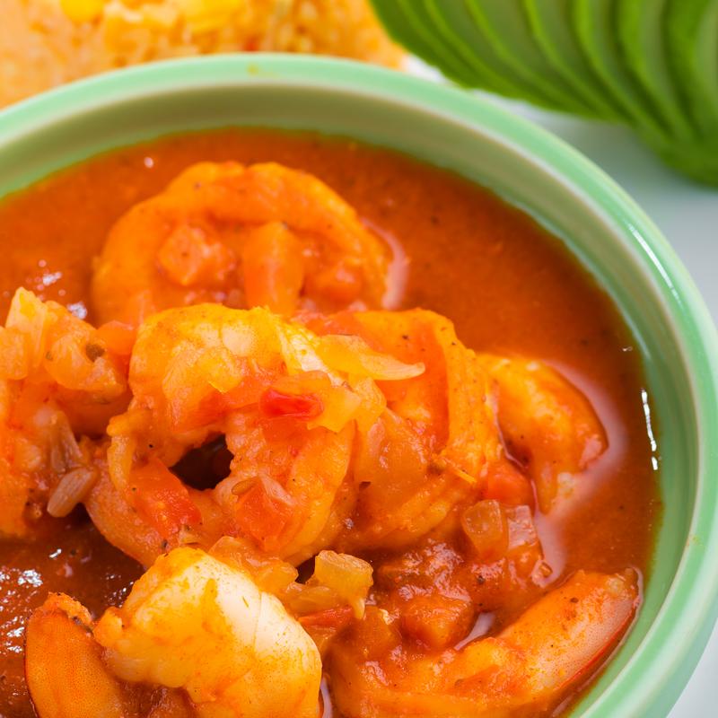 Sautéed shrimp in spicy tomato sauce; rice and avocado.