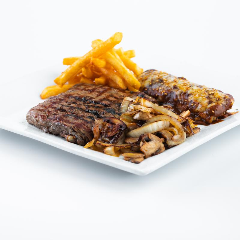 House-marinated grilled Teres Major steak (8oz.). Served with three sides: Creamy Onions & Poblano Peppers, Grilled Onions, Grilled Jalapenos, Grilled Mushrooms, Cheese Enchilada, Roasted Veggies, Guacamole, French Fries, Re-Fried Beans, Rice.