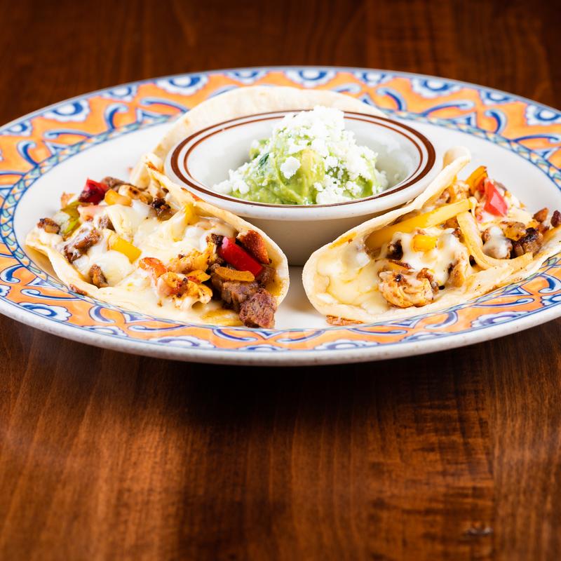 Three corn tacos with mixed grilled beef, chicken, and chorizo, bell peppers and onions. Topped with Chihuahua cheese. Choice of rice, beans or guacamole.