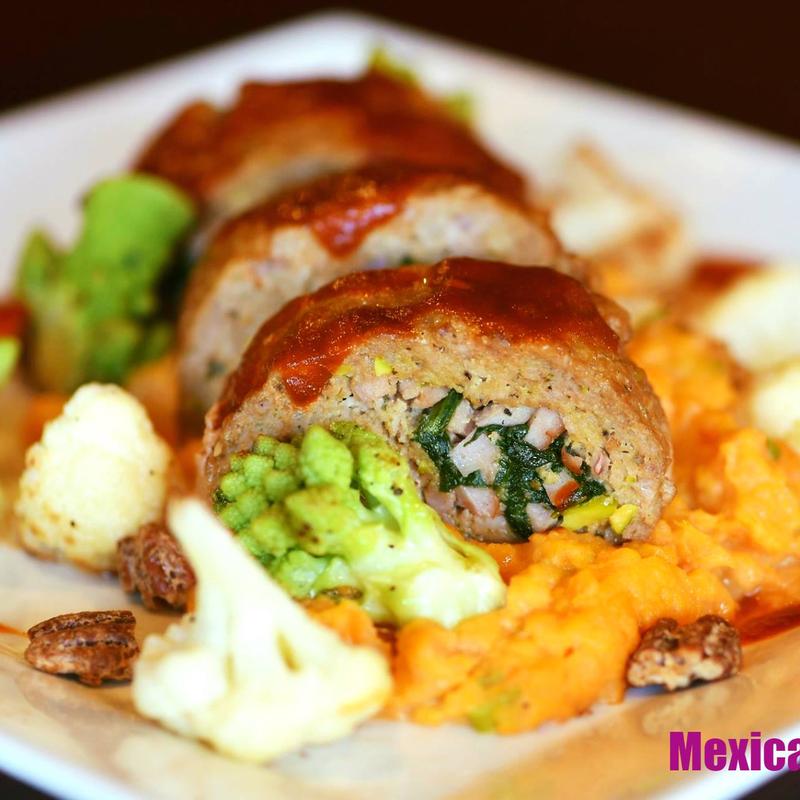 Pistachio Veal-pork & beef meat loaf / ham and spinach / guajillo-tamarindo-chipotle glaze / orange sweet potato mash / oven roasted cauliflower & romanesco broccoli,