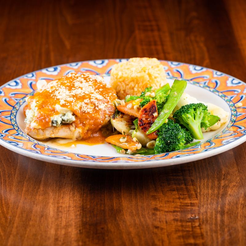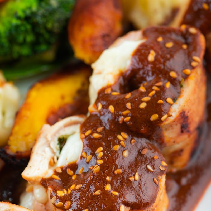 Chicken breast stuffed with spinach, ham and queso fresco. Doused with mole sauce -the classic mole from Puebla made with three chiles, pumpkin seeds, peanuts, almonds, sesame seeds, raisins, plantains, cinnamon, and natural chocolate, side of roasted veggies & rice.
