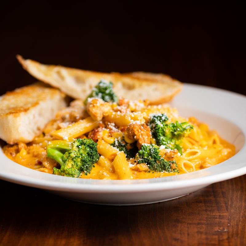 Penne pasta, tomato-cream chipotle sauce, broccoli, corn, cotija cheese, garlic bread | Add Shrimp +$5.00