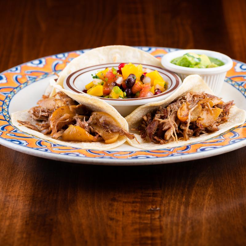 3 Corn tacos, duck confit and caramelized apples. Served with black-bean-mango salsa, and green tomatillo-avocado salsa.