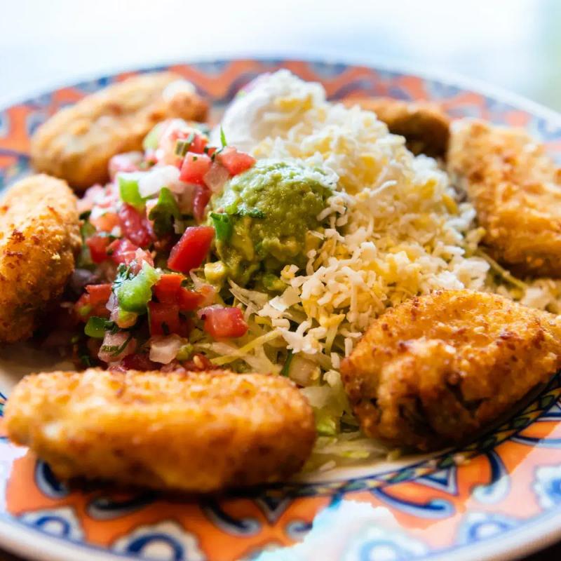 Soufflé-battered poblano pepper filled with mashed potatoes & cheese, tomato sauce, and rice.