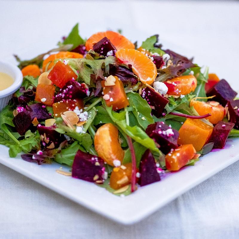 Red and golden oven-roasted beets / mandarin wedges /spring mix / goat cheese / toasted almonds /pomegranate seeds / citrus vinaigrette
