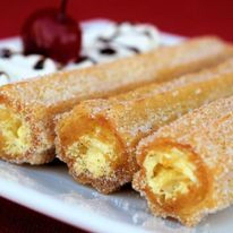 25 doughnut-like cinnamon sticks filled with Bavarian cream. Served with chocolate syrup.