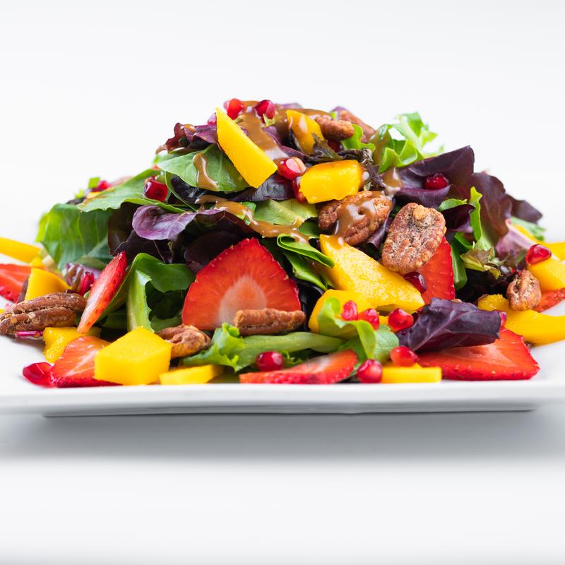 Spring mix, strawberries, mango, pomegranate seeds, caramelized pecans, balsamic dressing.